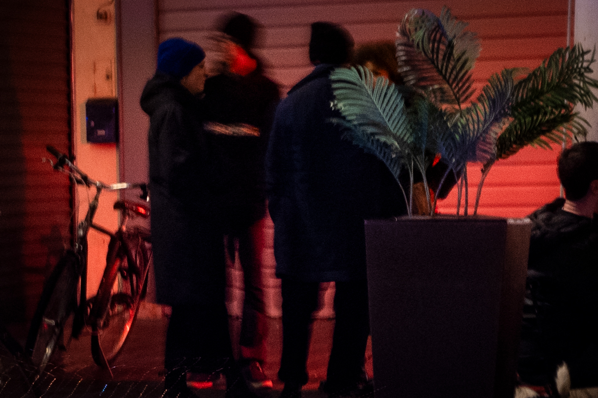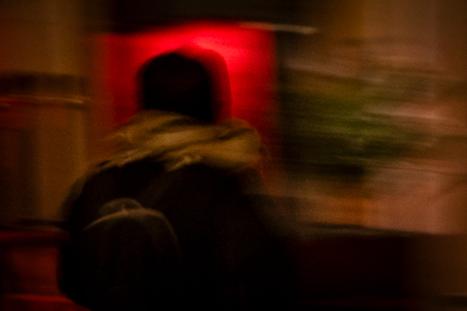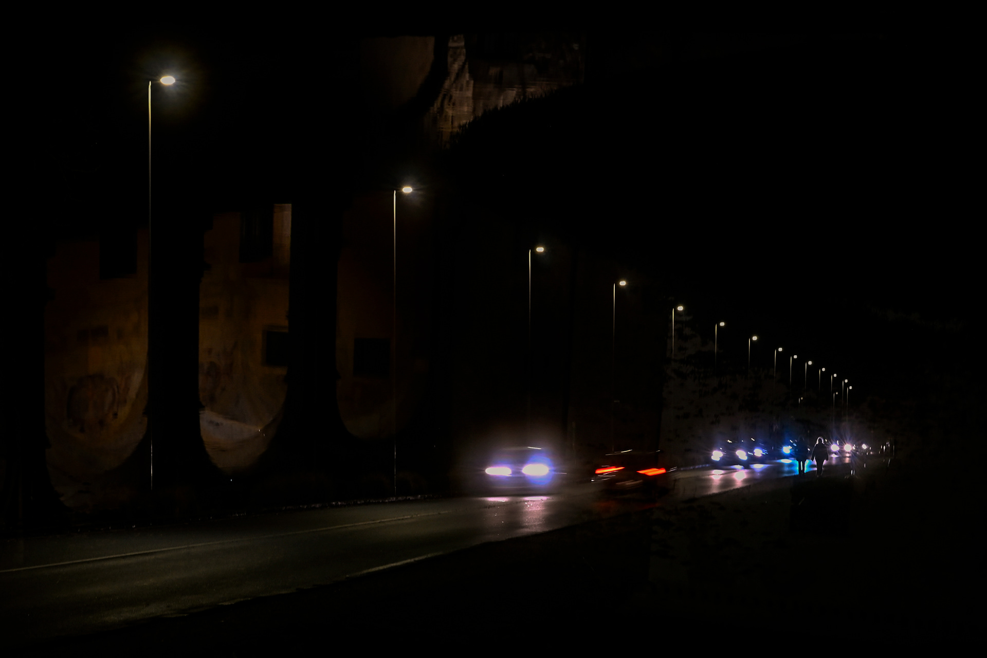 La luce artificiale diventa elemento instabile, frammentario. Non illumina in modo definitivo, ma interviene per interruzioni, creando soglie e zone d’ombra. In questo spazio, la presenza umana è discreta, mai centrale: figure che attraversano, che misurano il tempo presente senza dominarlo.
