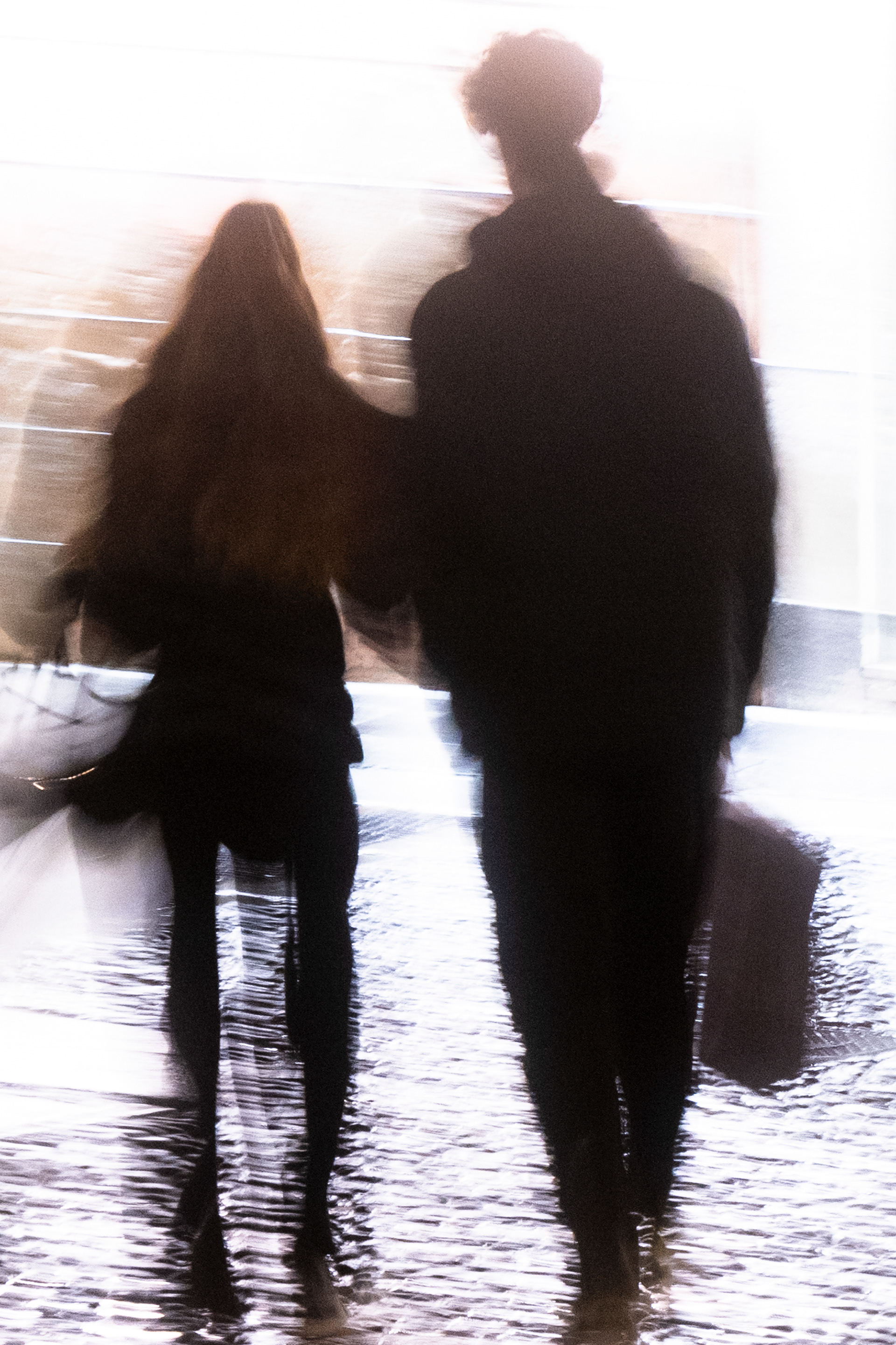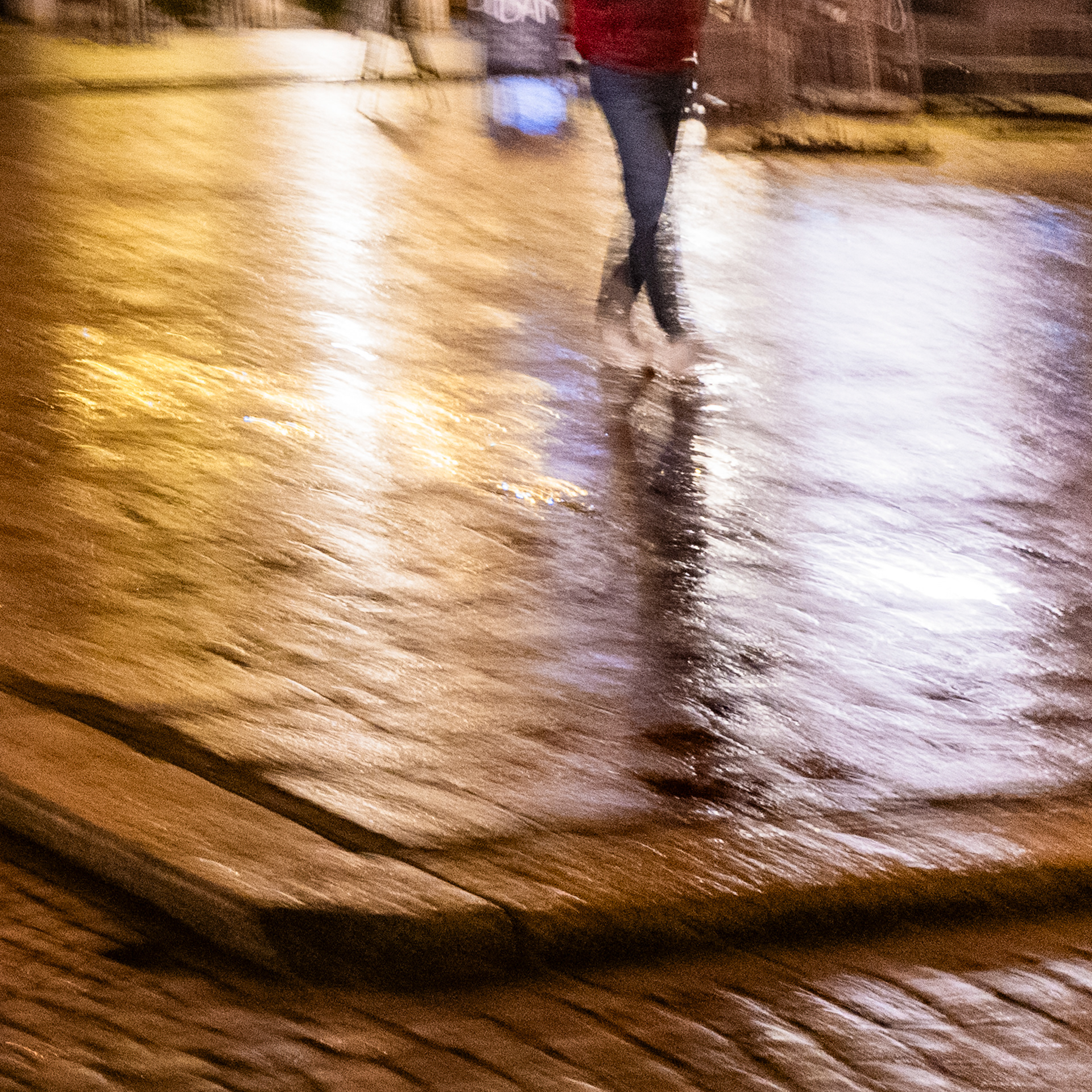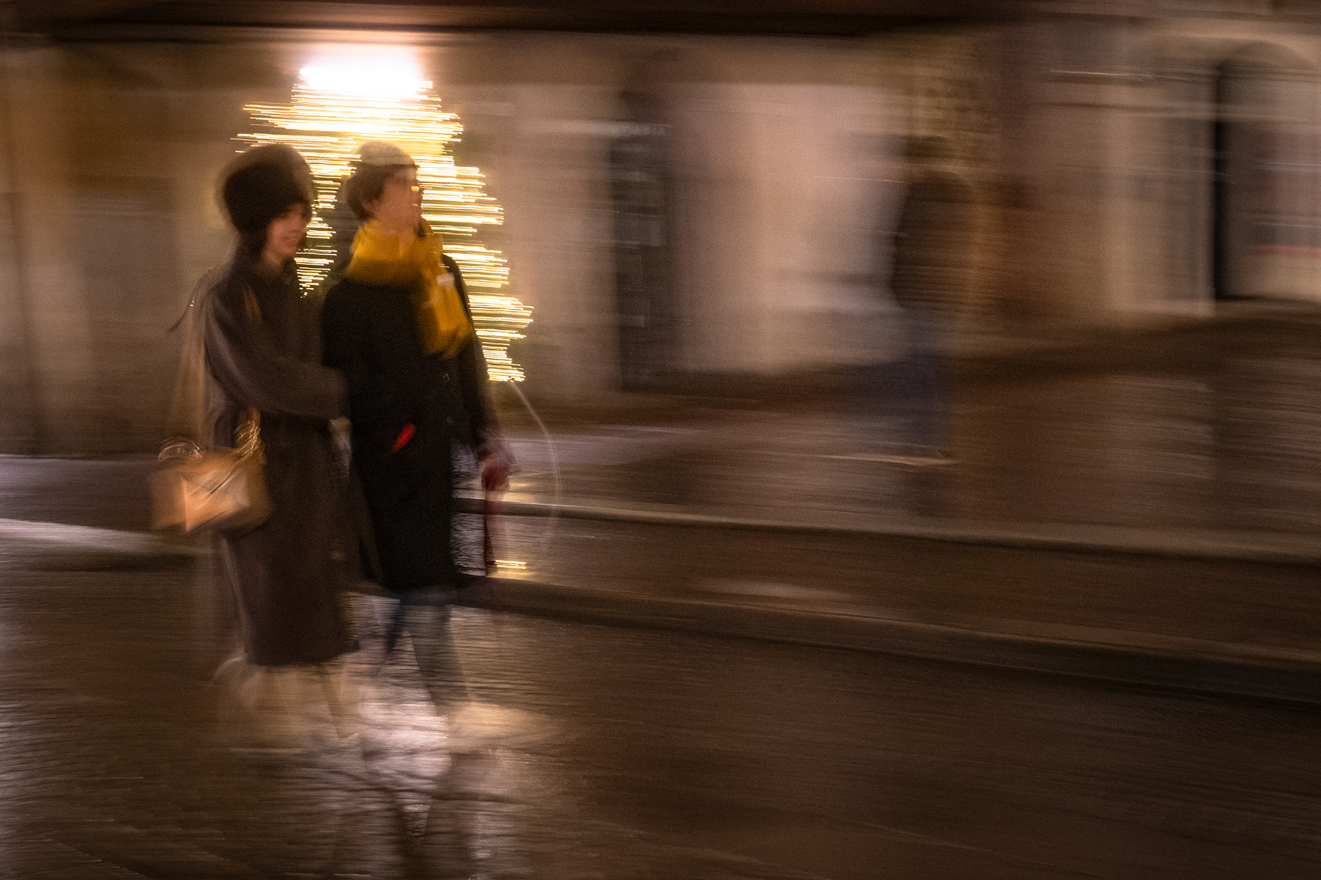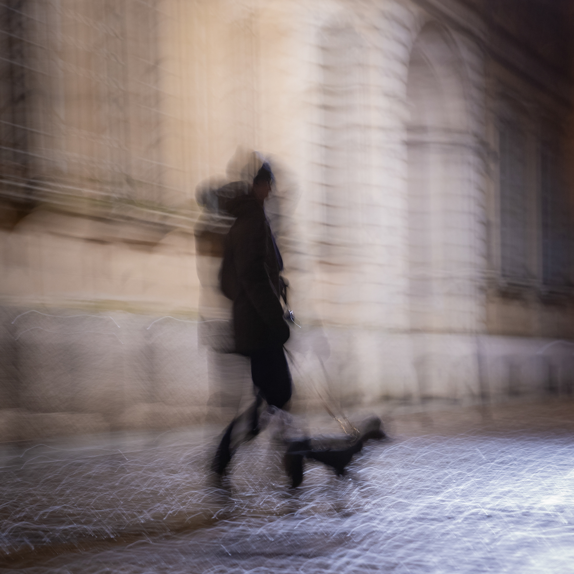 La luce artificiale diventa elemento instabile, frammentario. Non illumina in modo definitivo, ma interviene per interruzioni, creando soglie e zone d’ombra. In questo spazio, la presenza umana è discreta, mai centrale: figure che attraversano, che misurano il tempo presente senza dominarlo.